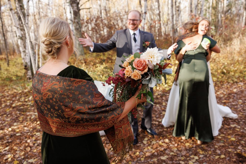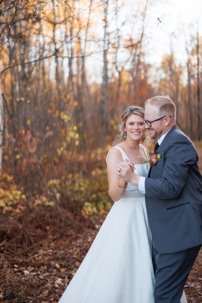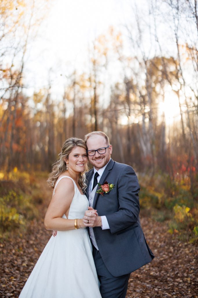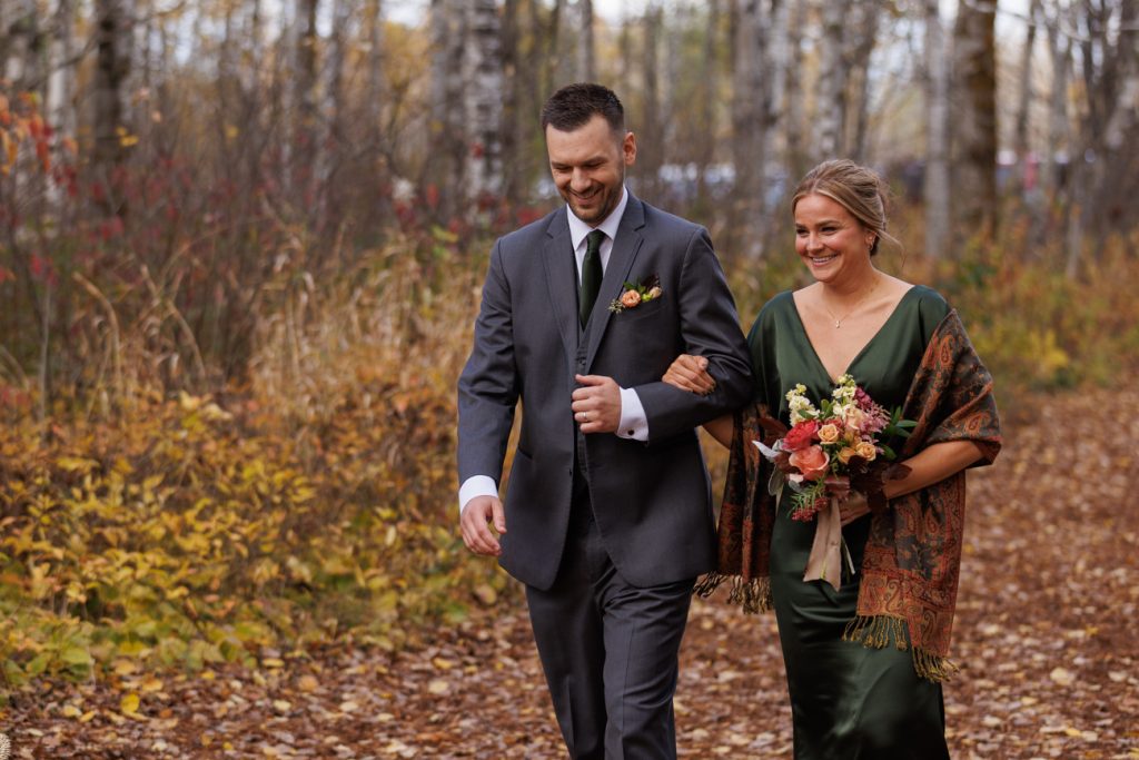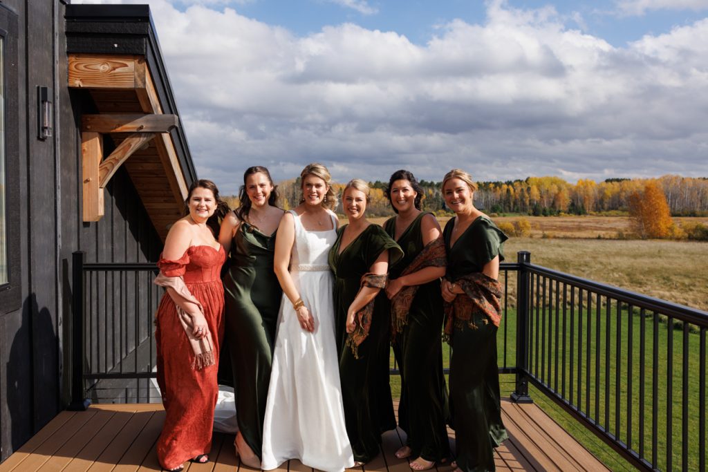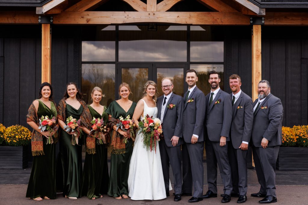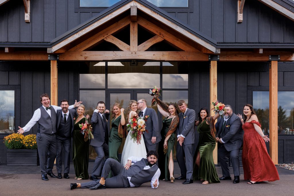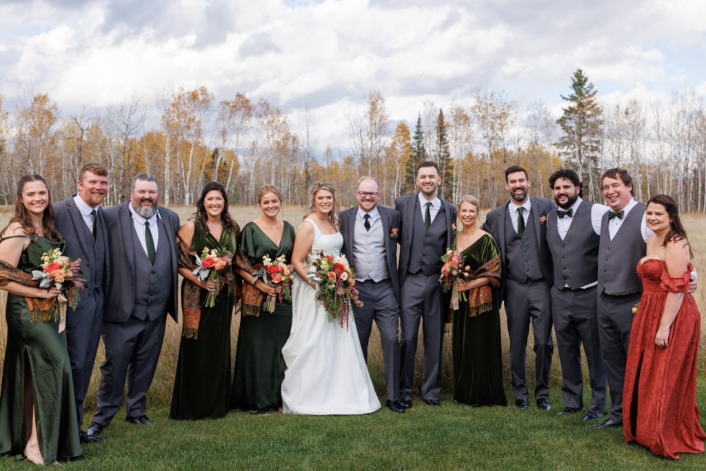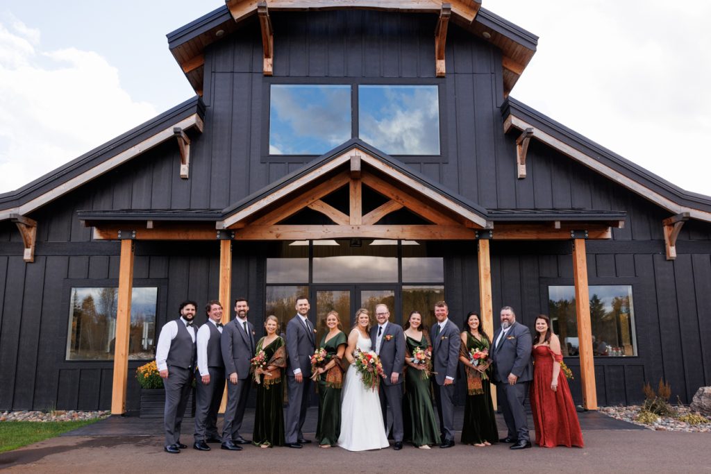 Congratulations Mary and Alex! What a perfect fall wedding day. We adore this couple! Ivy Black is one of our favorite wedding venues, located just outside of Duluth, Minnesota. The day started with laughter with the bridesmaids and groomsmen, they had separate getting ready rooms. The bridal room is on the second level and it is perfect for those first beautiful moments with the bride. After the “first look” we had fun around the fabulous property taking photos. The ceremony was among the falling leaves in the forest, it was stunning! Ivy Black was decked out with gorgeous decorations and fresh flowers. Black Woods Catering provided a delicious charcuterie board to feed hundreds of guests. Mary surprised Alex with a personal grand march announcement from the voice of the Viking, Alan Roach! The dance was so much fun with Sounds Unlimited DJ. Enjoy the videography by Bethany and the photography by Beau, AMAZING memories!
