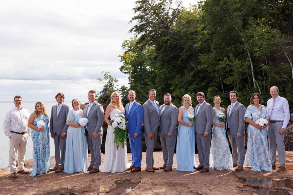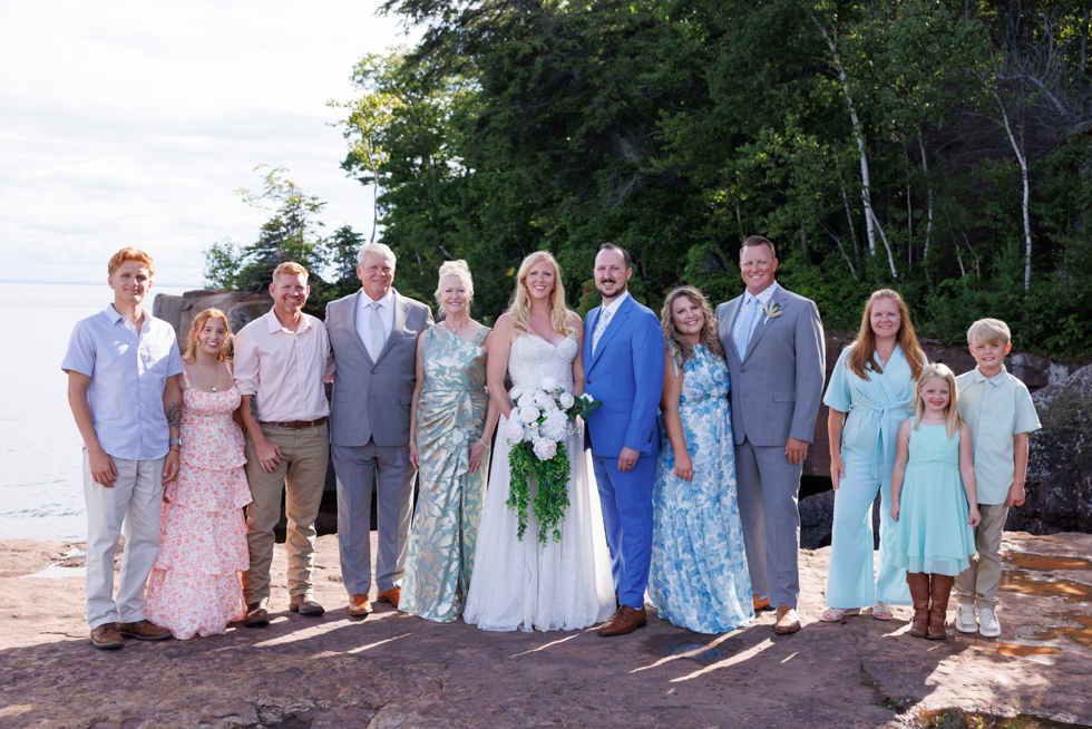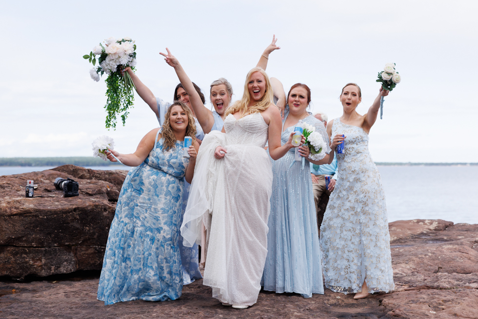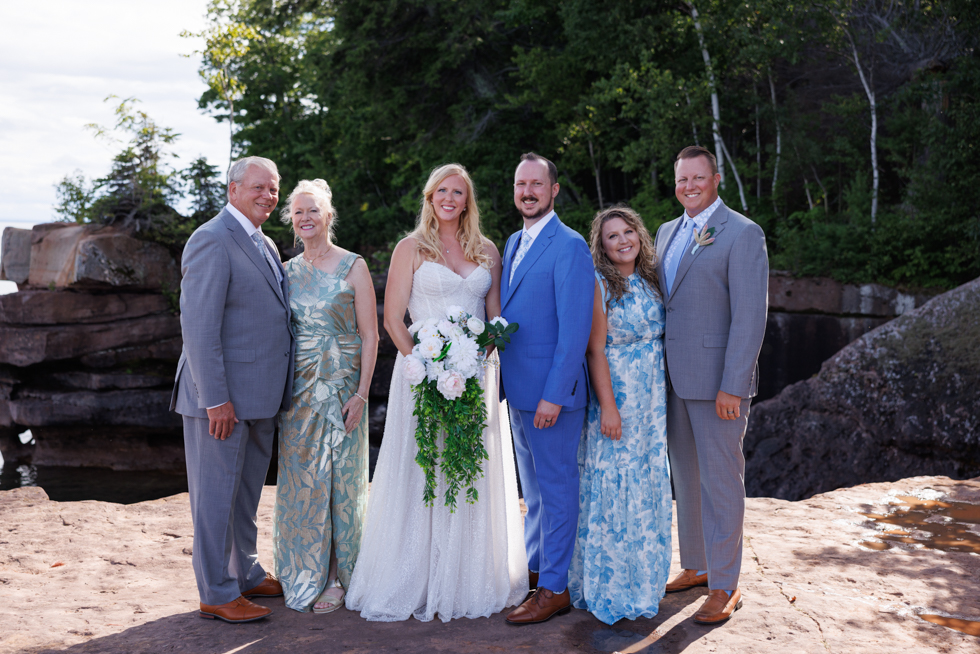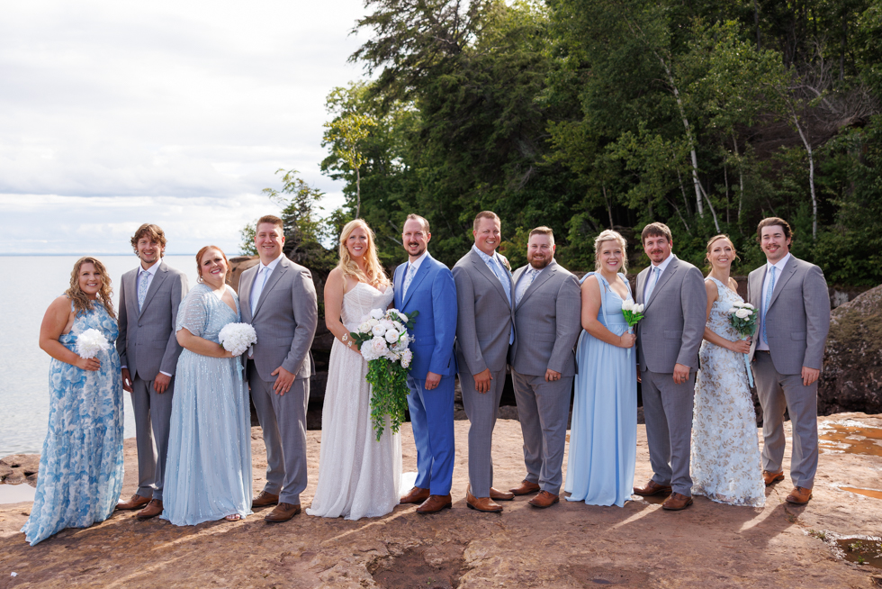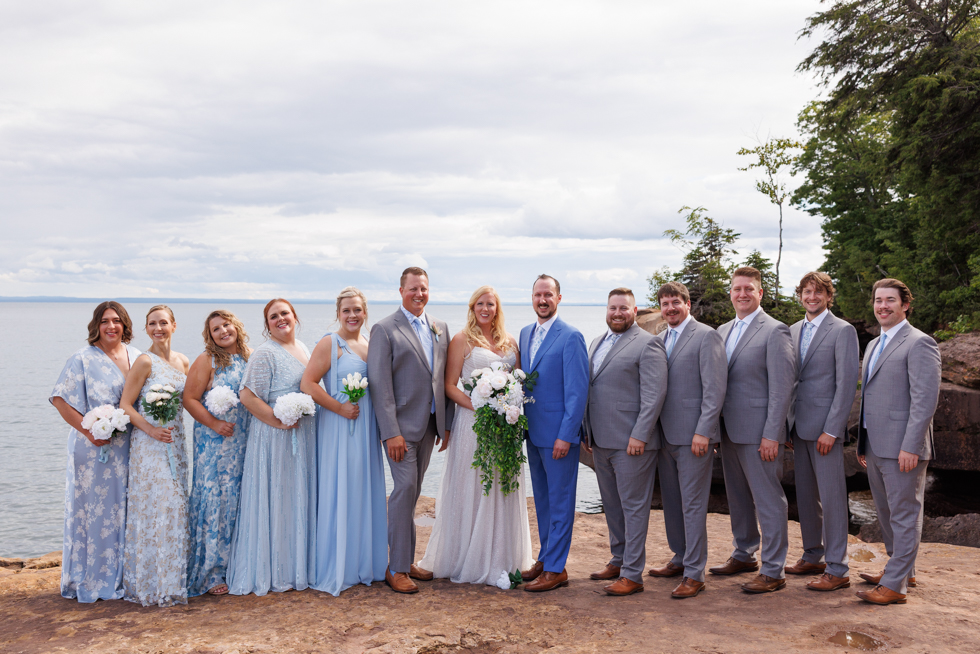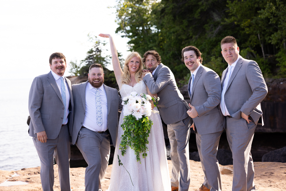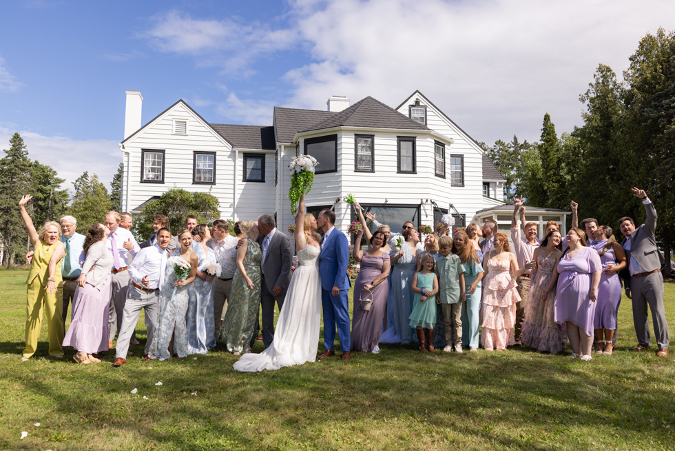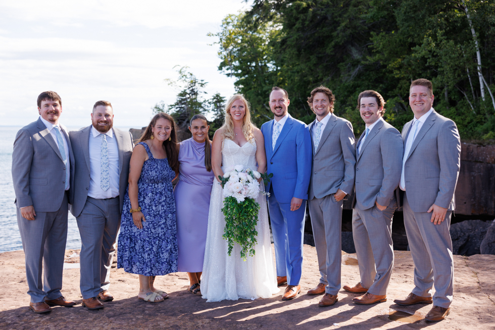Congratulations Sarah and Max! What a fabulous destination wedding at Island Estate on Madeline Island. We started off the day taking the ferry from Bayfield to LaPointe, WI. As we pulled into the driveway of Island Estate we were greeted by the groom. There was energetic music playing throughout the house while the wedding party got ready. Max got ready in the game room and Sarah got ready in a bright airy guest room upstairs. The first look was as Sarah walked down the aisle in the backyard, a beautiful waterfront ceremony was set for the scene. The bride and groom said “I do” with a secret handshake!! After the ceremony champagne was popped and toasts were made… then we headed off to the state park for some Lake Superior cliff photos with the whole group. The reception continued with a cocktail hour back at Island Estate. Catering was by Fat Radish, so yummy. After dinner there was a fabulous sunset!! Everyone went inside for more speeches and then we ended the day with a fabulous dance. Enjoy the photos and video to remember the day.