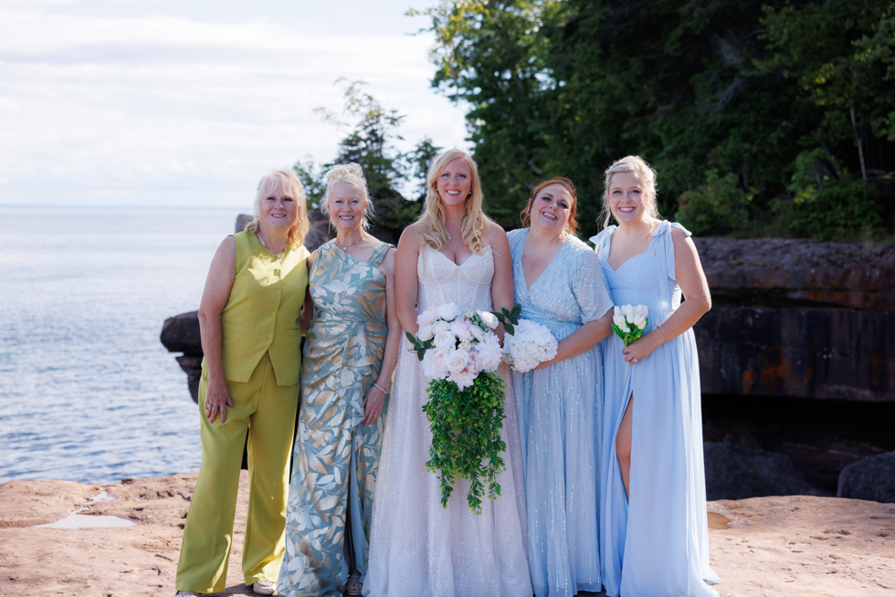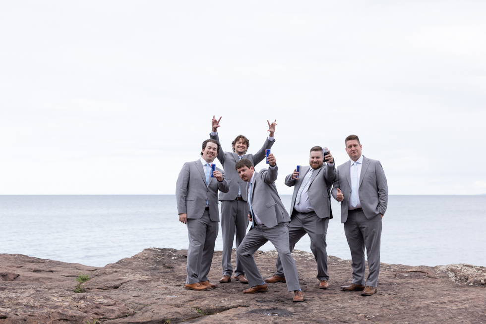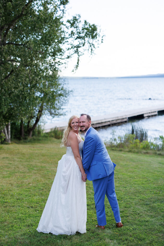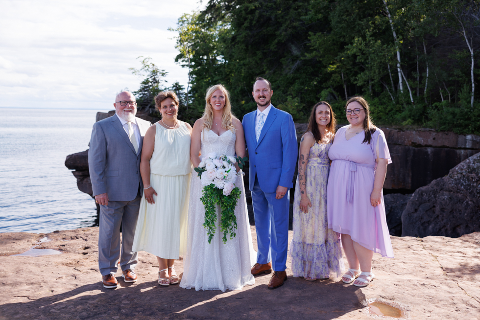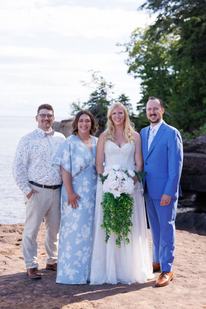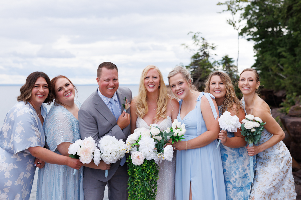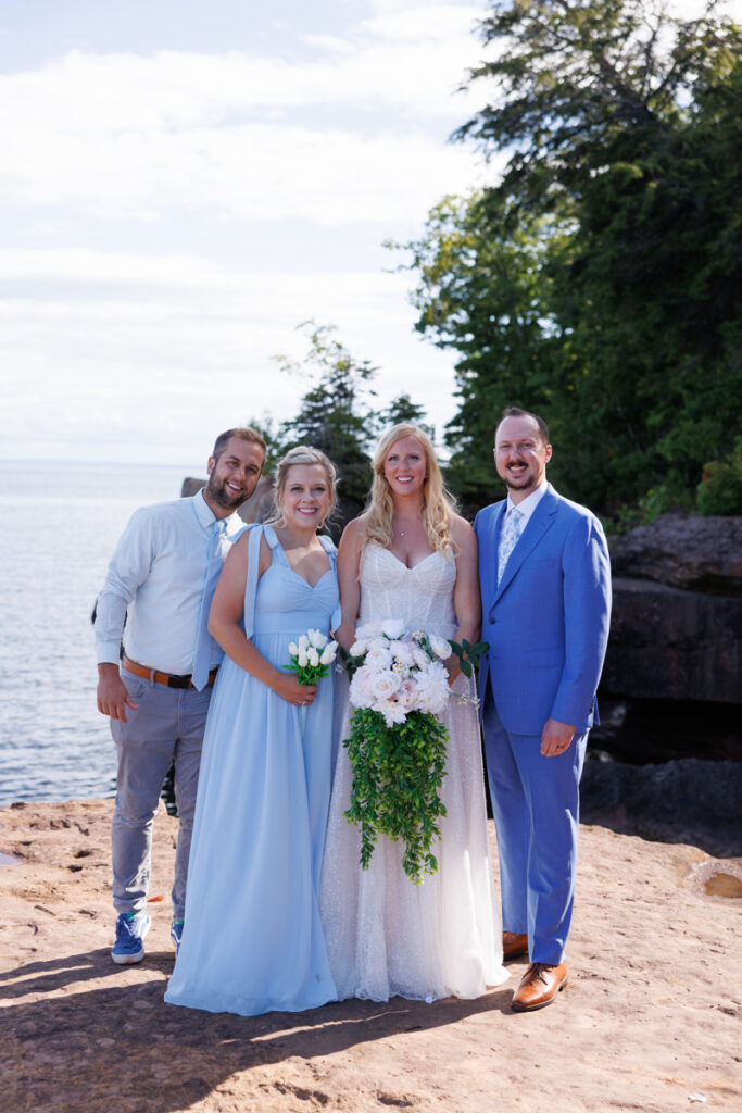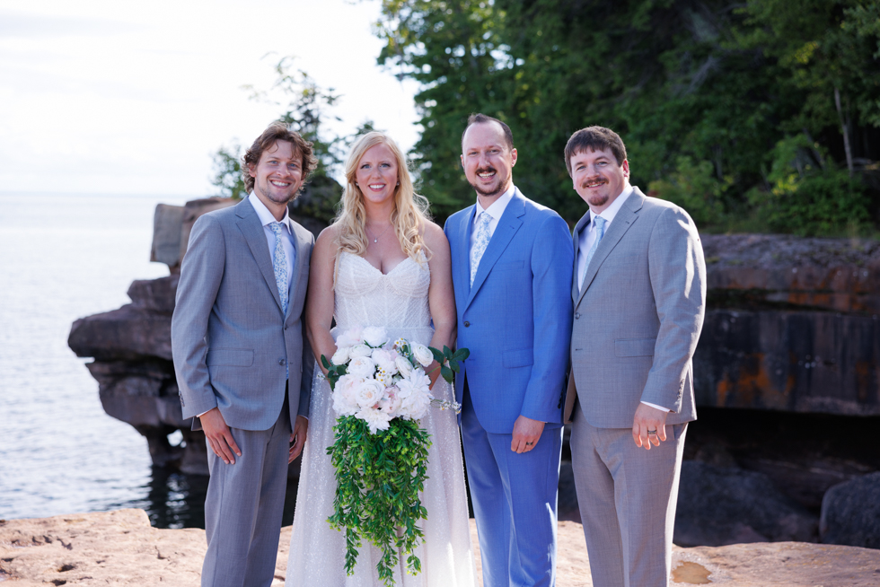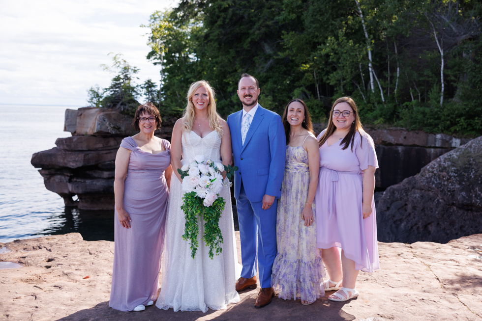 Congratulations Sarah and Max! What a fabulous destination wedding at Island Estate on Madeline Island. We started off the day taking the ferry from Bayfield to LaPointe, WI. As we pulled into the driveway of Island Estate we were greeted by the groom. There was energetic music playing throughout the house while the wedding party got ready. Max got ready in the game room and Sarah got ready in a bright airy guest room upstairs. The first look was as Sarah walked down the aisle in the backyard, a beautiful waterfront ceremony was set for the scene. The bride and groom said “I do” with a secret handshake!! After the ceremony champagne was popped and toasts were made… then we headed off to the state park for some Lake Superior cliff photos with the whole group. The reception continued with a cocktail hour back at Island Estate. Catering was by Fat Radish, so yummy. After dinner there was a fabulous sunset!! Everyone went inside for more speeches and then we ended the day with a fabulous dance. Enjoy the photos and video to remember the day.