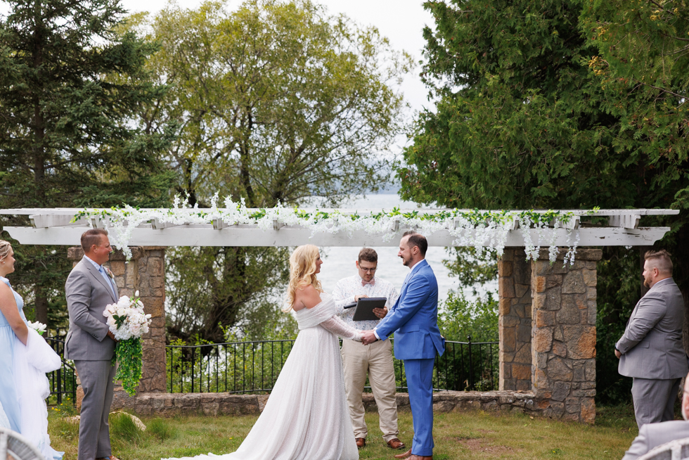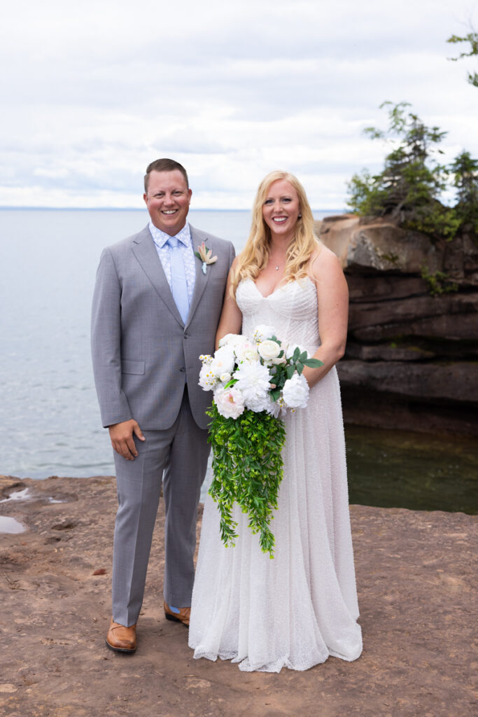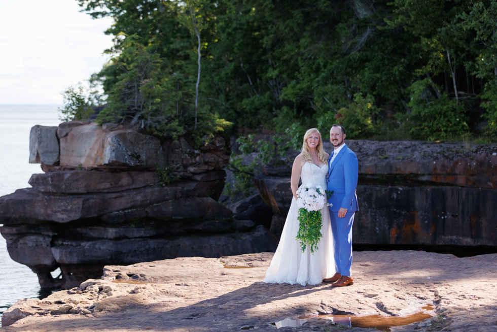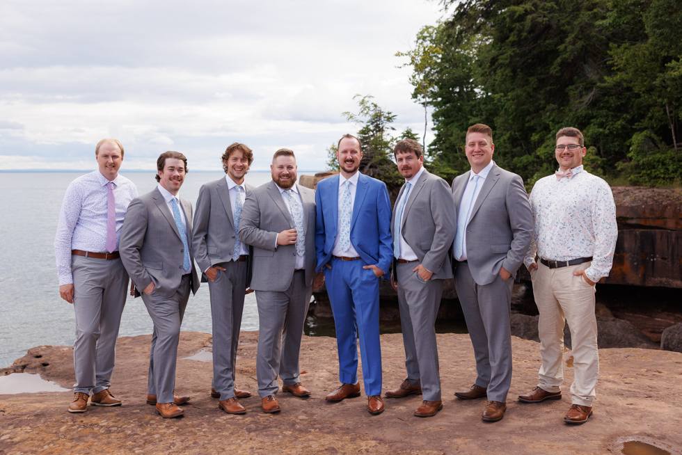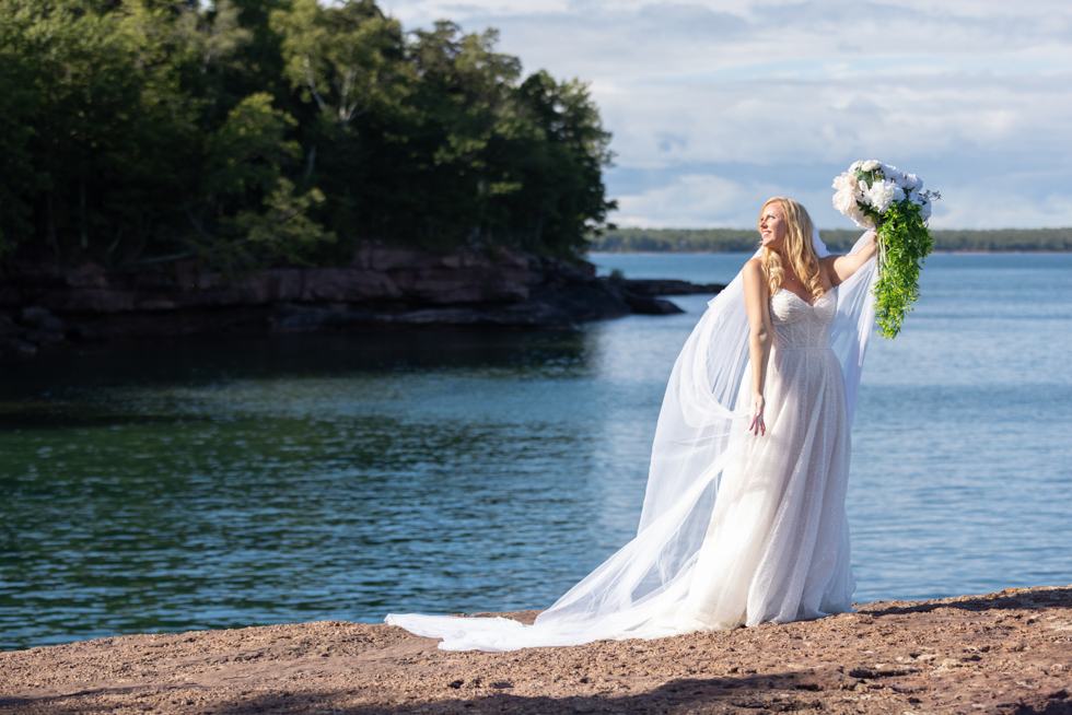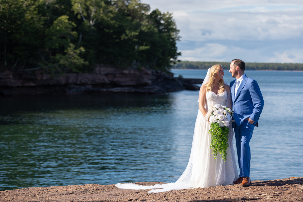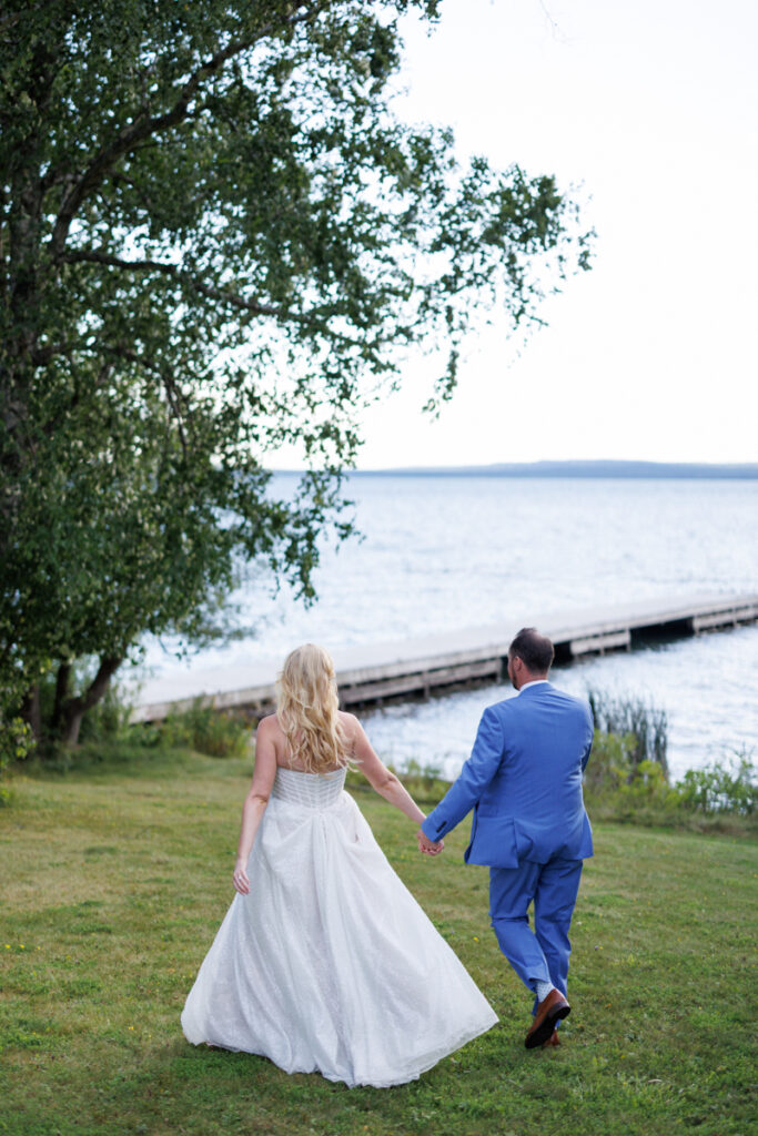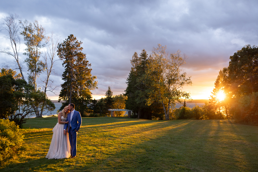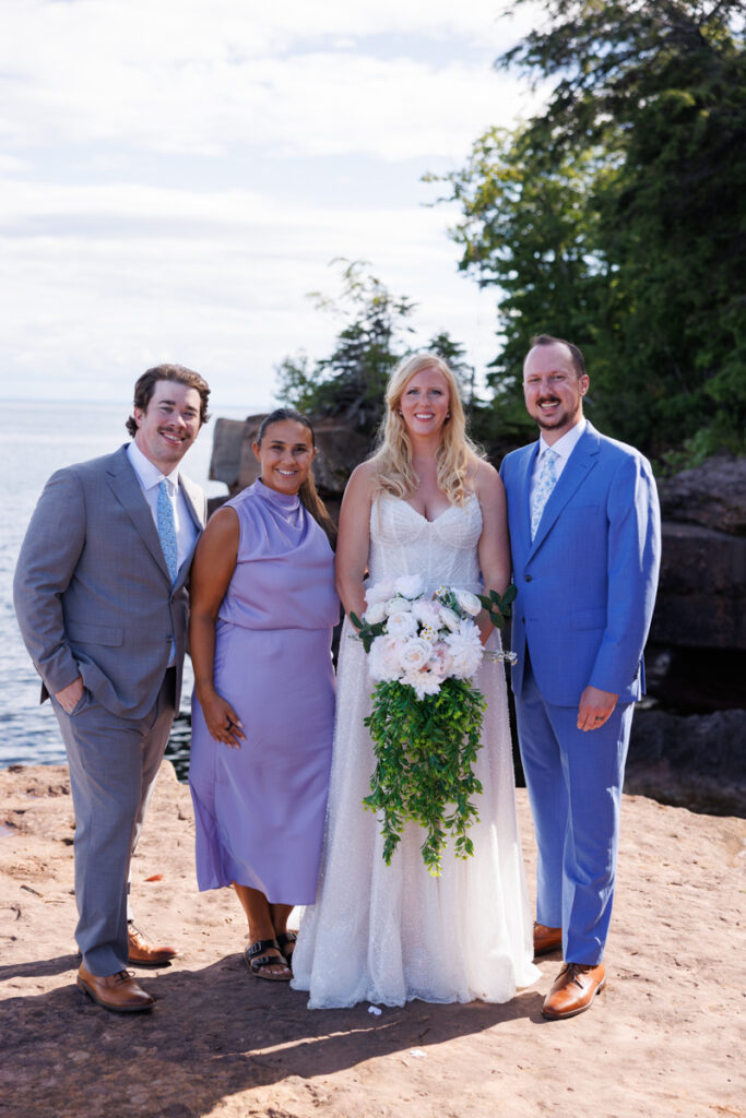Congratulations Sarah and Max! What a fabulous destination wedding at Island Estate on Madeline Island. We started off the day taking the ferry from Bayfield to LaPointe, WI. As we pulled into the driveway of Island Estate we were greeted by the groom. There was energetic music playing throughout the house while the wedding party got ready. Max got ready in the game room and Sarah got ready in a bright airy guest room upstairs. The first look was as Sarah walked down the aisle in the backyard, a beautiful waterfront ceremony was set for the scene. The bride and groom said “I do” with a secret handshake!! After the ceremony champagne was popped and toasts were made… then we headed off to the state park for some Lake Superior cliff photos with the whole group. The reception continued with a cocktail hour back at Island Estate. Catering was by Fat Radish, so yummy. After dinner there was a fabulous sunset!! Everyone went inside for more speeches and then we ended the day with a fabulous dance. Enjoy the photos and video to remember the day.