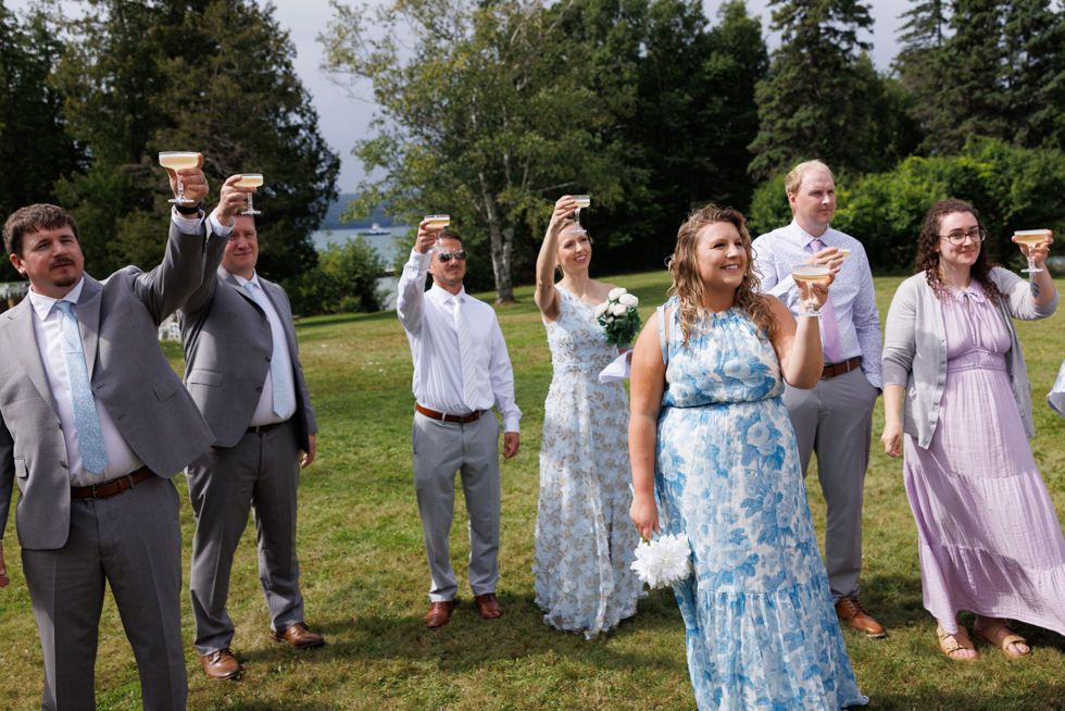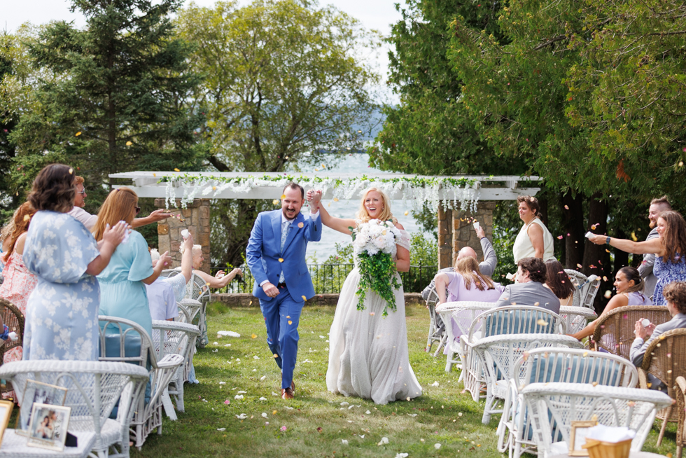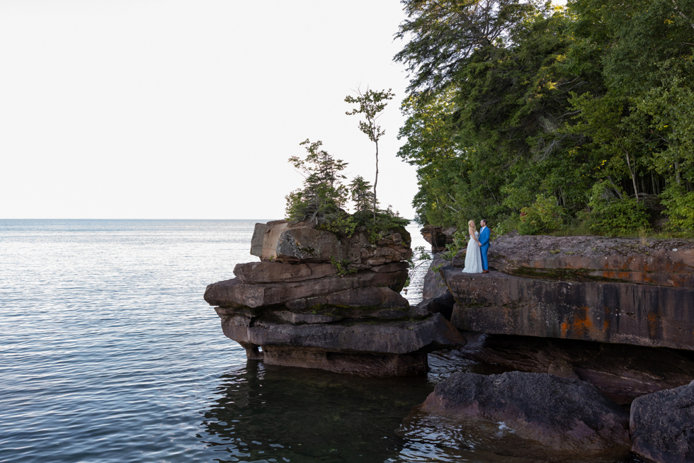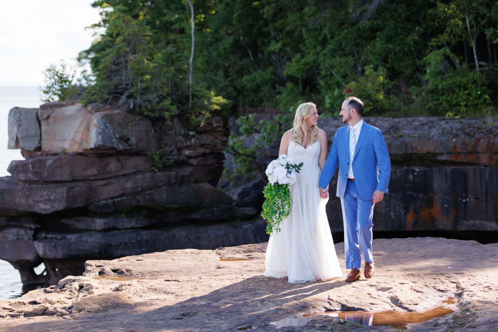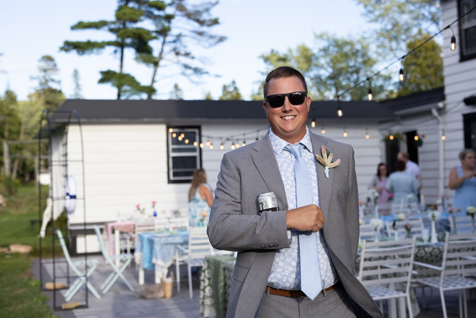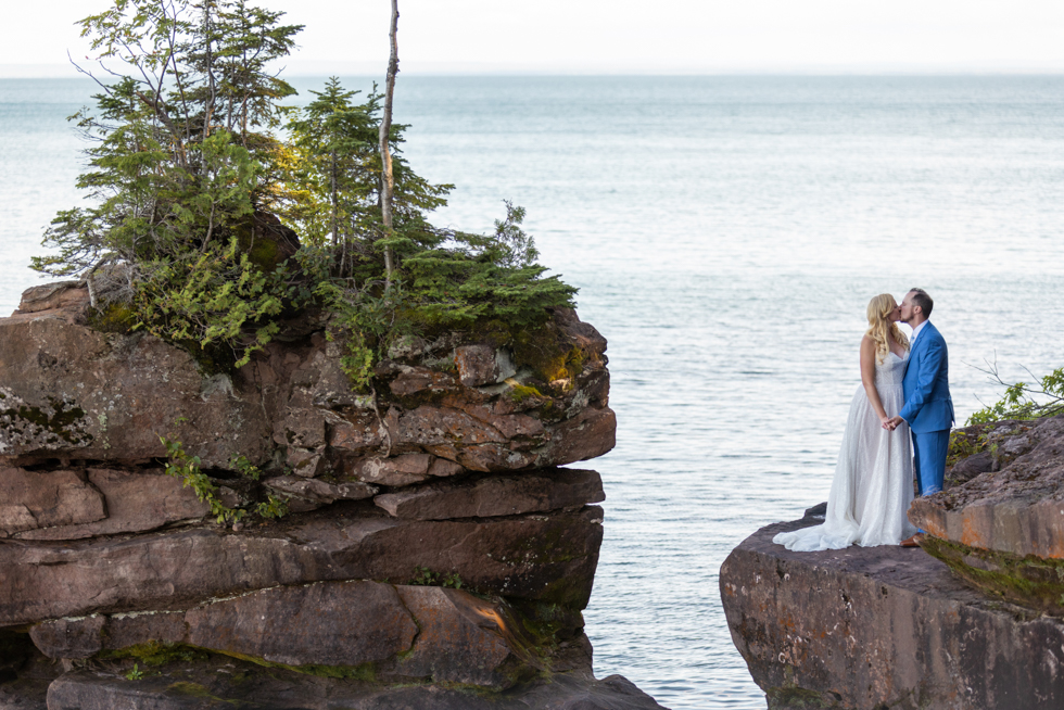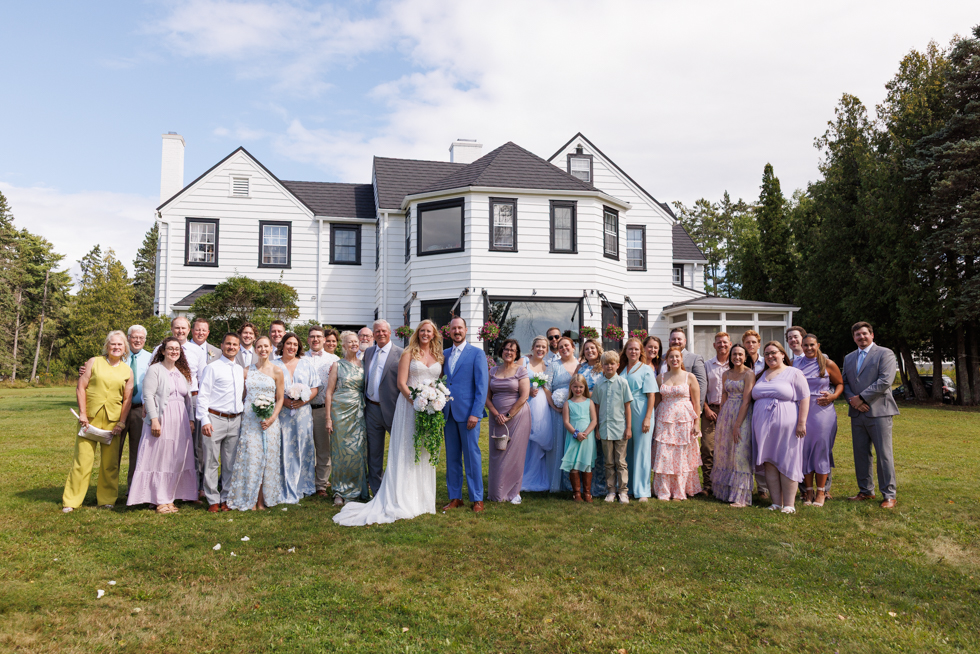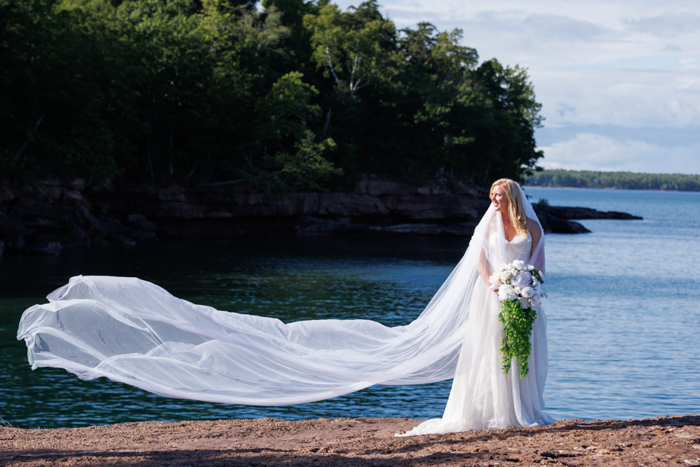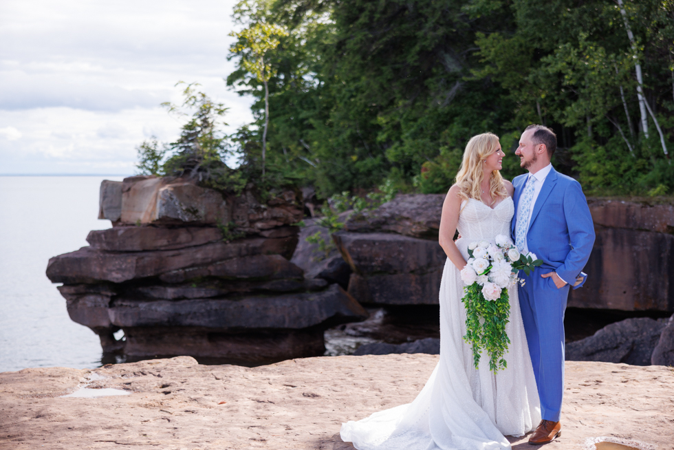 Congratulations Sarah and Max! What a fabulous destination wedding at Island Estate on Madeline Island. We started off the day taking the ferry from Bayfield to LaPointe, WI. As we pulled into the driveway of Island Estate we were greeted by the groom. There was energetic music playing throughout the house while the wedding party got ready. Max got ready in the game room and Sarah got ready in a bright airy guest room upstairs. The first look was as Sarah walked down the aisle in the backyard, a beautiful waterfront ceremony was set for the scene. The bride and groom said “I do” with a secret handshake!! After the ceremony champagne was popped and toasts were made… then we headed off to the state park for some Lake Superior cliff photos with the whole group. The reception continued with a cocktail hour back at Island Estate. Catering was by Fat Radish, so yummy. After dinner there was a fabulous sunset!! Everyone went inside for more speeches and then we ended the day with a fabulous dance. Enjoy the photos and video to remember the day.