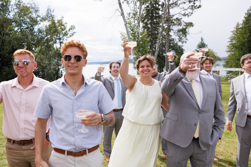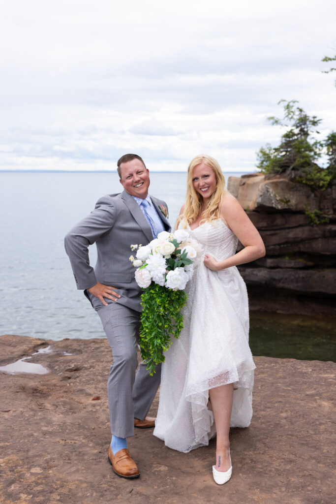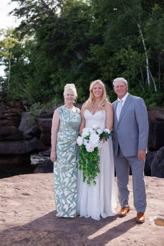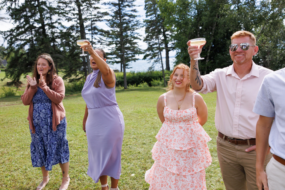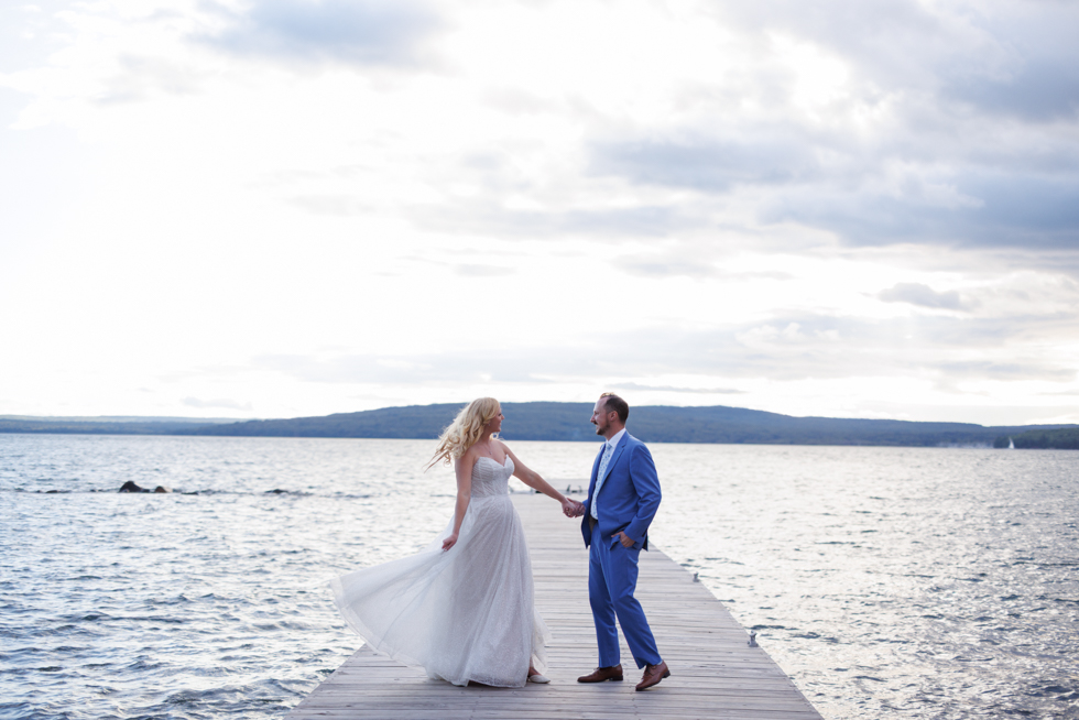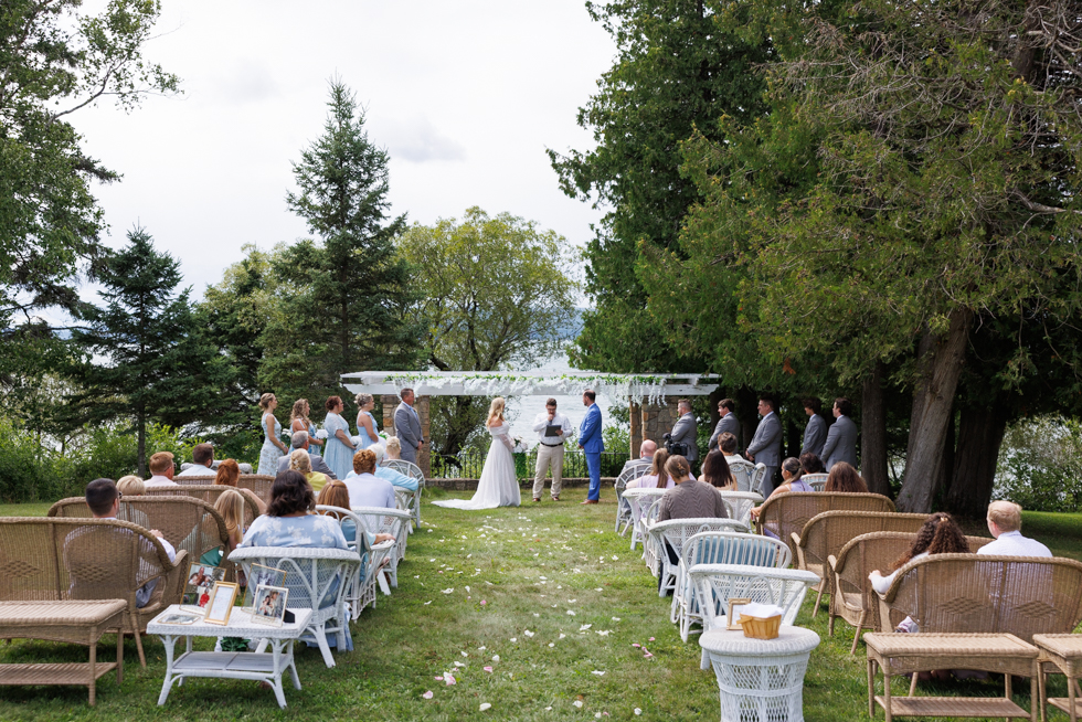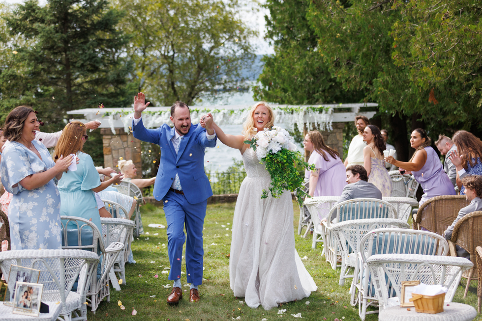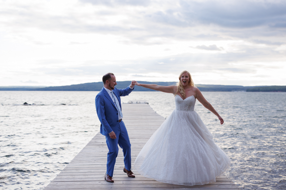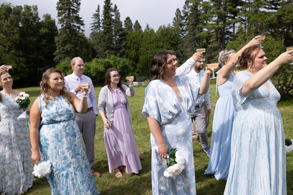 Congratulations Sarah and Max! What a fabulous destination wedding at Island Estate on Madeline Island. We started off the day taking the ferry from Bayfield to LaPointe, WI. As we pulled into the driveway of Island Estate we were greeted by the groom. There was energetic music playing throughout the house while the wedding party got ready. Max got ready in the game room and Sarah got ready in a bright airy guest room upstairs. The first look was as Sarah walked down the aisle in the backyard, a beautiful waterfront ceremony was set for the scene. The bride and groom said “I do” with a secret handshake!! After the ceremony champagne was popped and toasts were made… then we headed off to the state park for some Lake Superior cliff photos with the whole group. The reception continued with a cocktail hour back at Island Estate. Catering was by Fat Radish, so yummy. After dinner there was a fabulous sunset!! Everyone went inside for more speeches and then we ended the day with a fabulous dance. Enjoy the photos and video to remember the day.