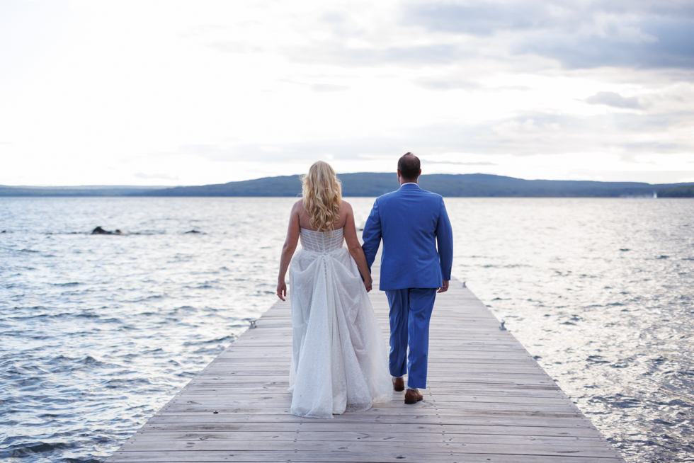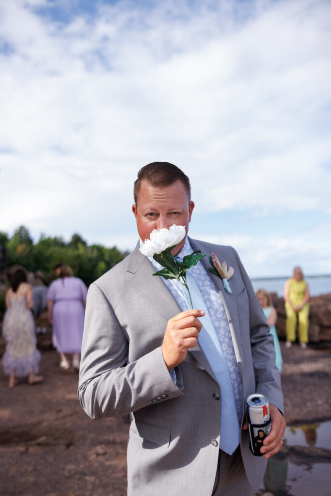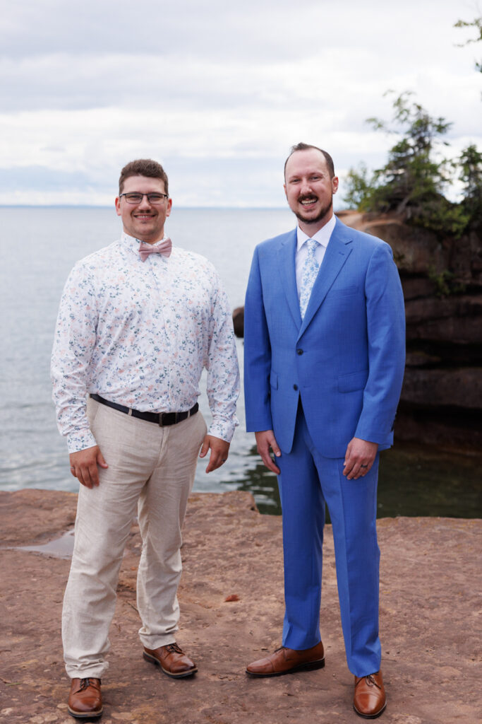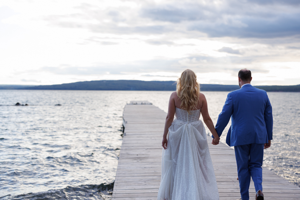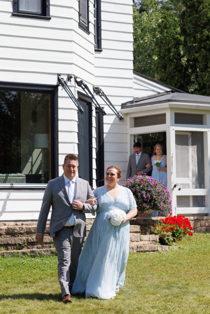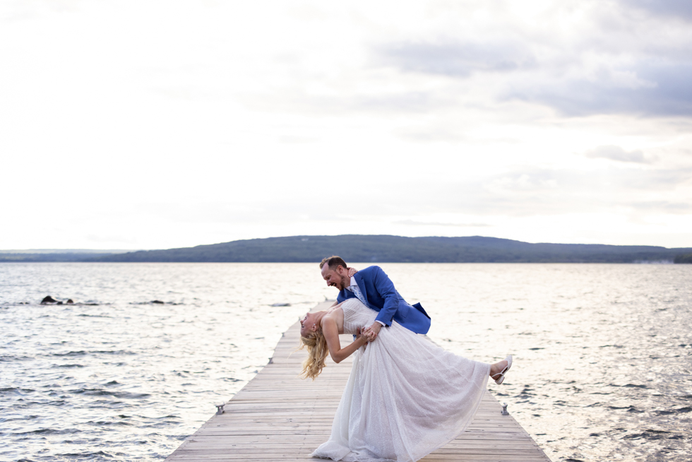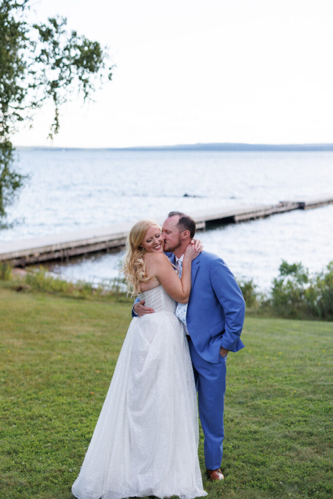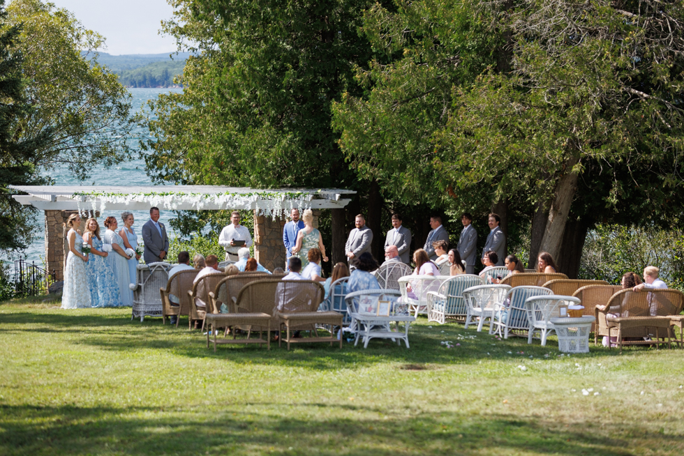 Congratulations Sarah and Max! What a fabulous destination wedding at Island Estate on Madeline Island. We started off the day taking the ferry from Bayfield to LaPointe, WI. As we pulled into the driveway of Island Estate we were greeted by the groom. There was energetic music playing throughout the house while the wedding party got ready. Max got ready in the game room and Sarah got ready in a bright airy guest room upstairs. The first look was as Sarah walked down the aisle in the backyard, a beautiful waterfront ceremony was set for the scene. The bride and groom said “I do” with a secret handshake!! After the ceremony champagne was popped and toasts were made… then we headed off to the state park for some Lake Superior cliff photos with the whole group. The reception continued with a cocktail hour back at Island Estate. Catering was by Fat Radish, so yummy. After dinner there was a fabulous sunset!! Everyone went inside for more speeches and then we ended the day with a fabulous dance. Enjoy the photos and video to remember the day.
