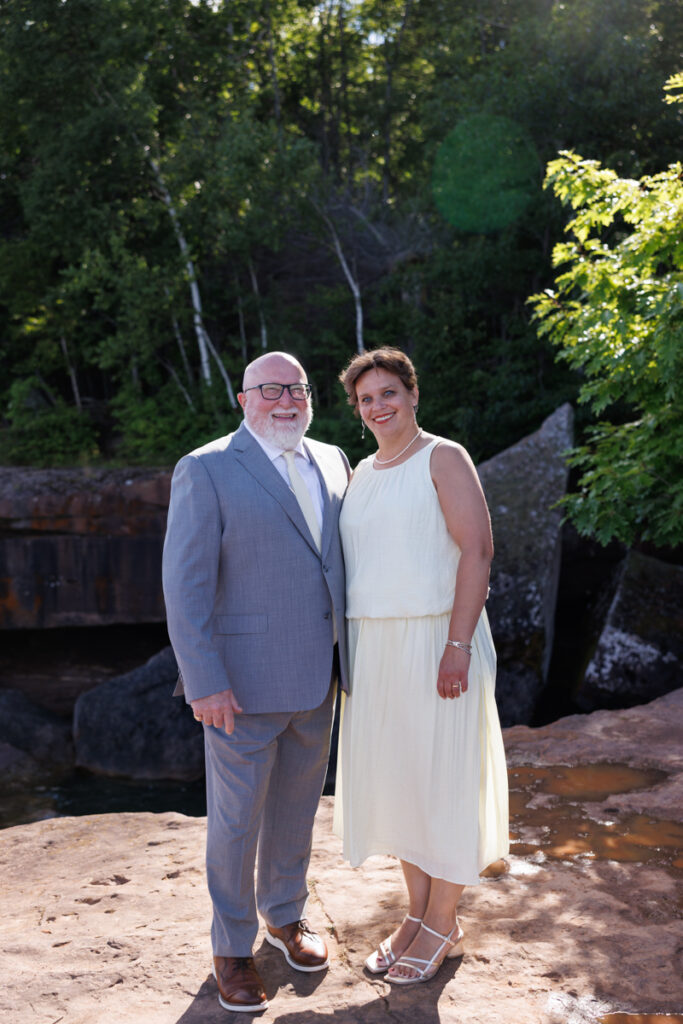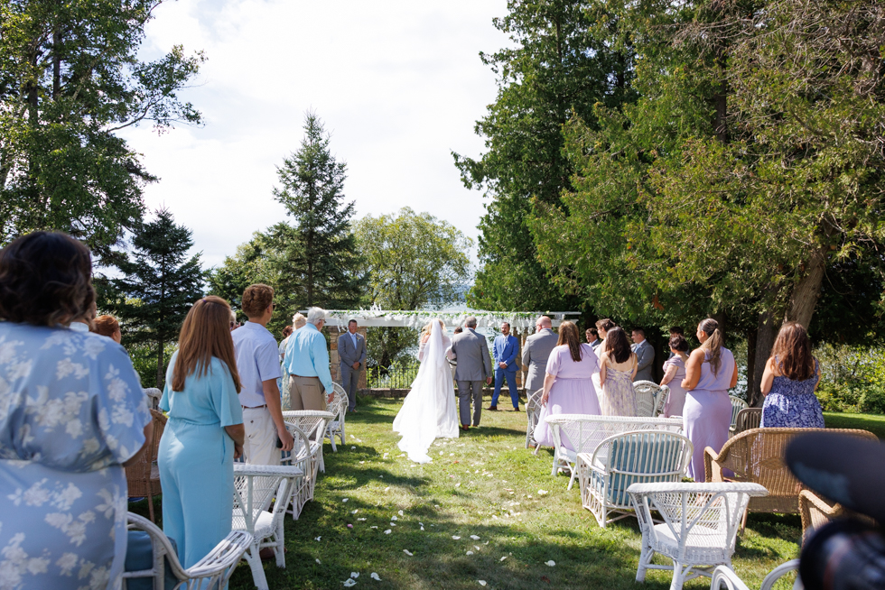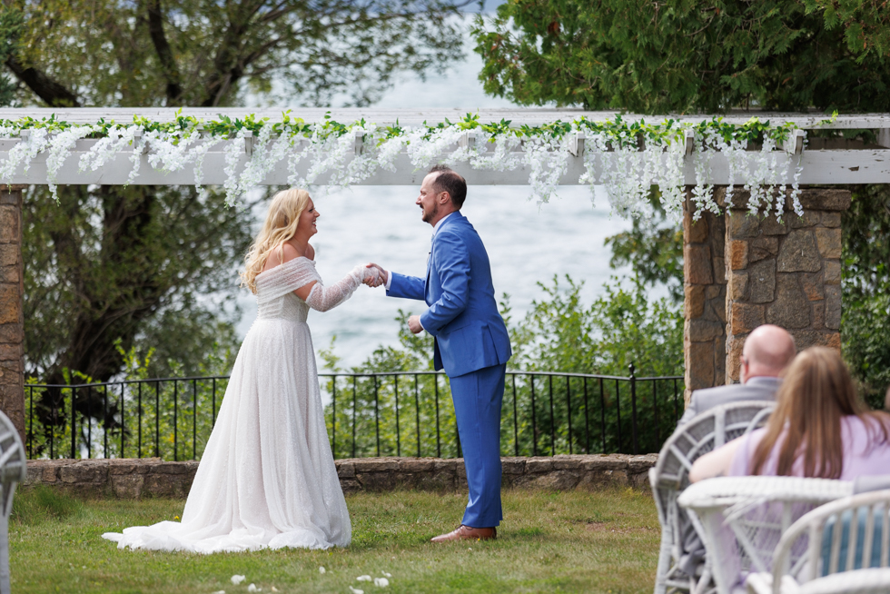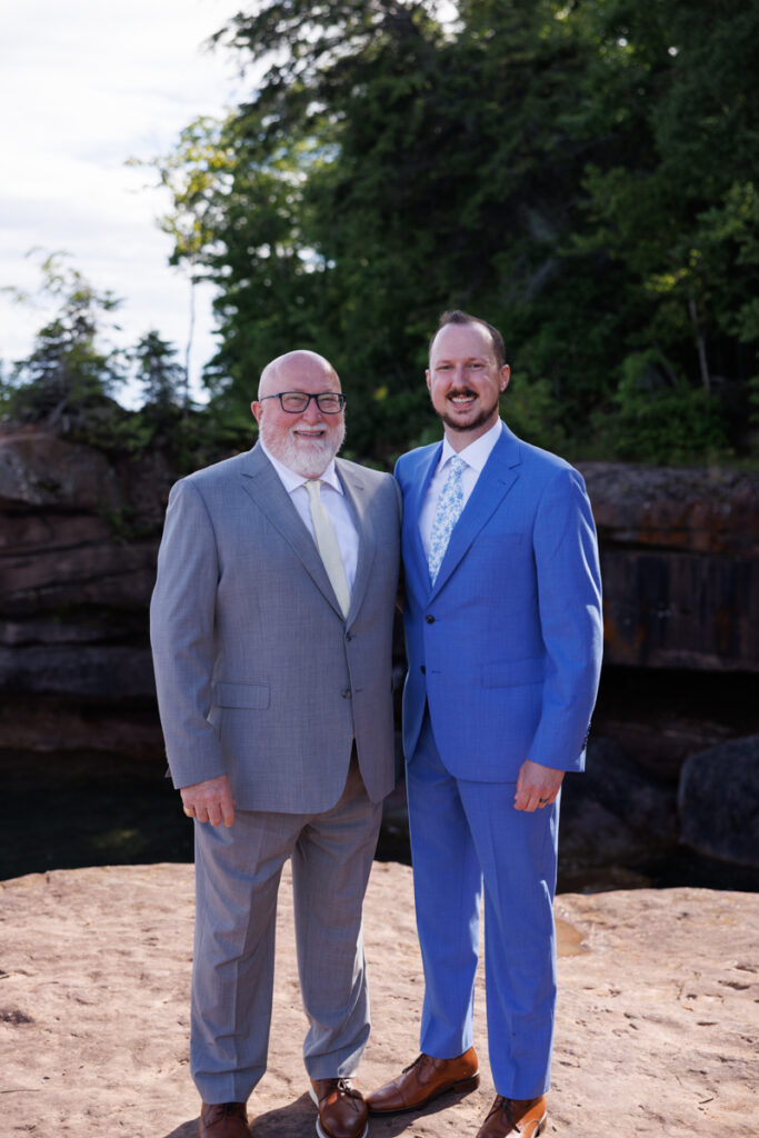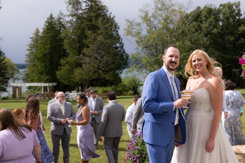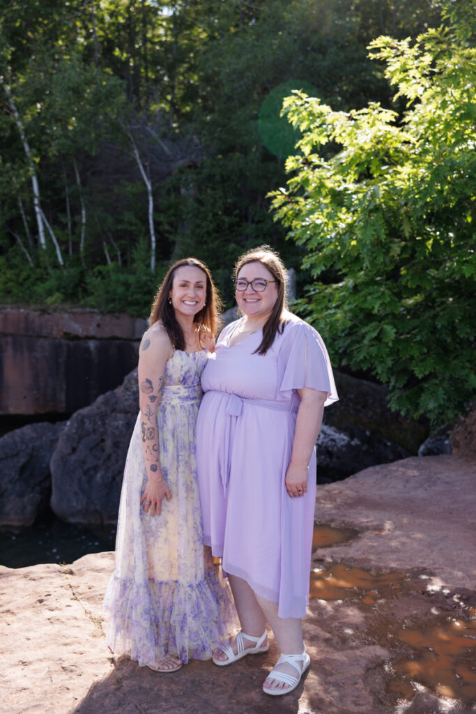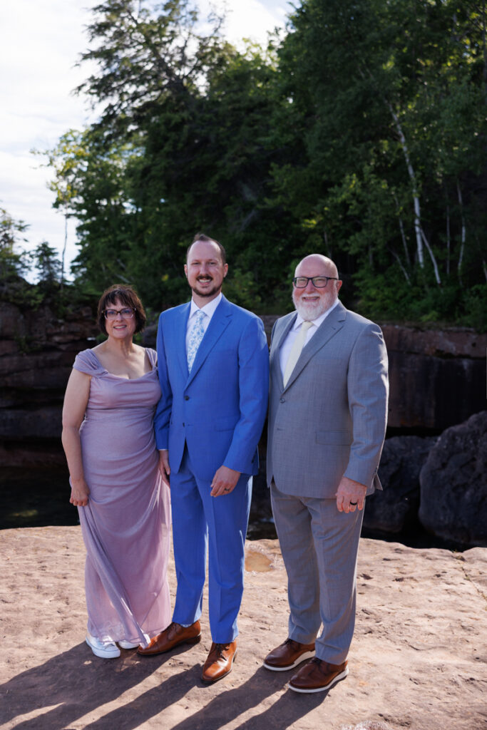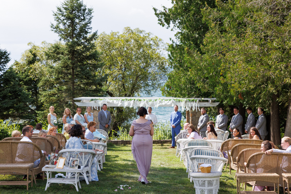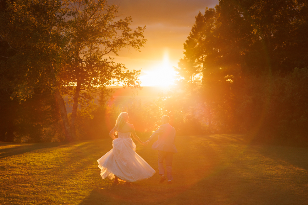 Congratulations Sarah and Max! What a fabulous destination wedding at Island Estate on Madeline Island. We started off the day taking the ferry from Bayfield to LaPointe, WI. As we pulled into the driveway of Island Estate we were greeted by the groom. There was energetic music playing throughout the house while the wedding party got ready. Max got ready in the game room and Sarah got ready in a bright airy guest room upstairs. The first look was as Sarah walked down the aisle in the backyard, a beautiful waterfront ceremony was set for the scene. The bride and groom said “I do” with a secret handshake!! After the ceremony champagne was popped and toasts were made… then we headed off to the state park for some Lake Superior cliff photos with the whole group. The reception continued with a cocktail hour back at Island Estate. Catering was by Fat Radish, so yummy. After dinner there was a fabulous sunset!! Everyone went inside for more speeches and then we ended the day with a fabulous dance. Enjoy the photos and video to remember the day.