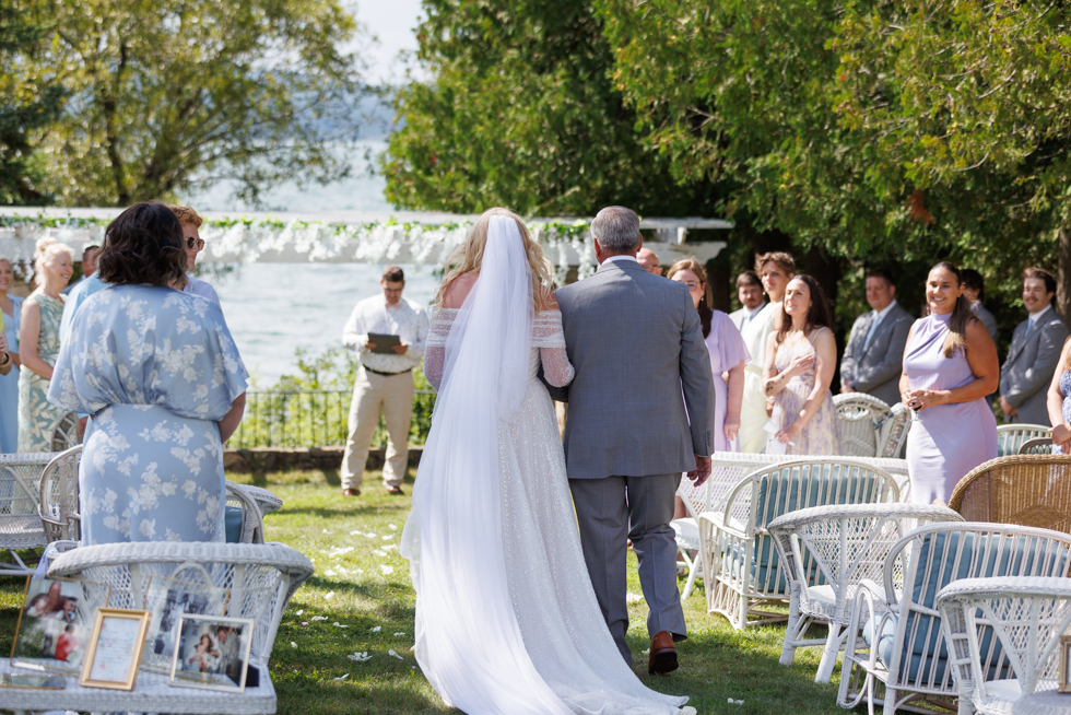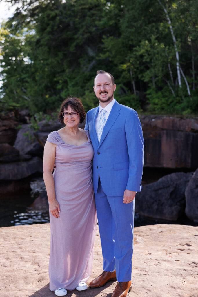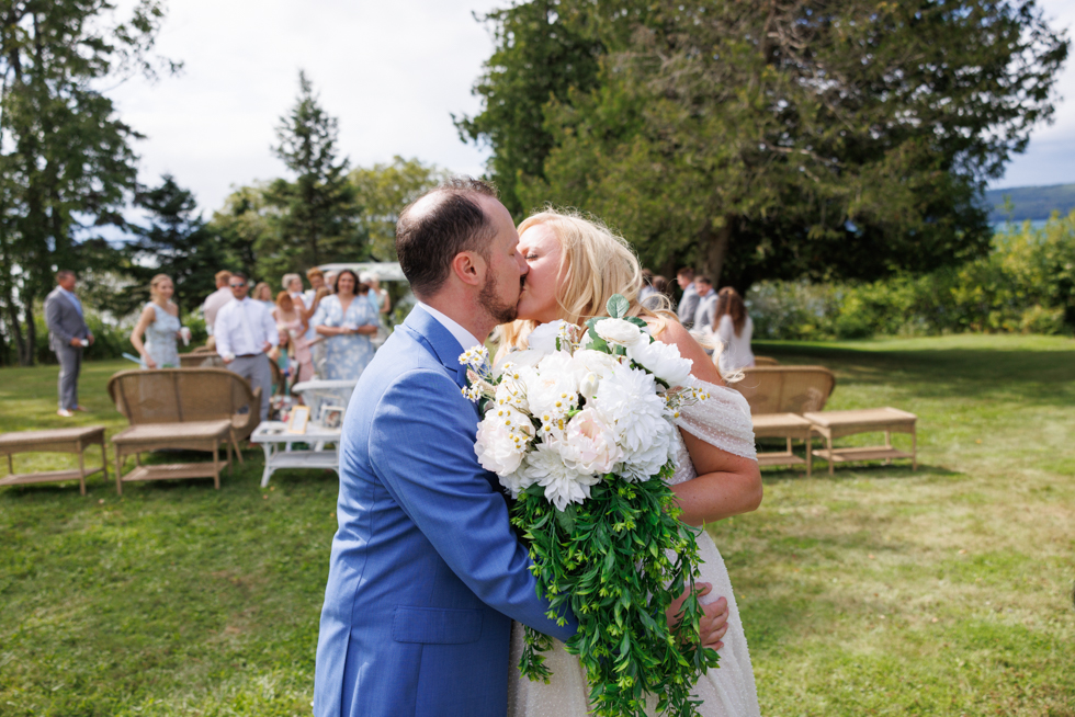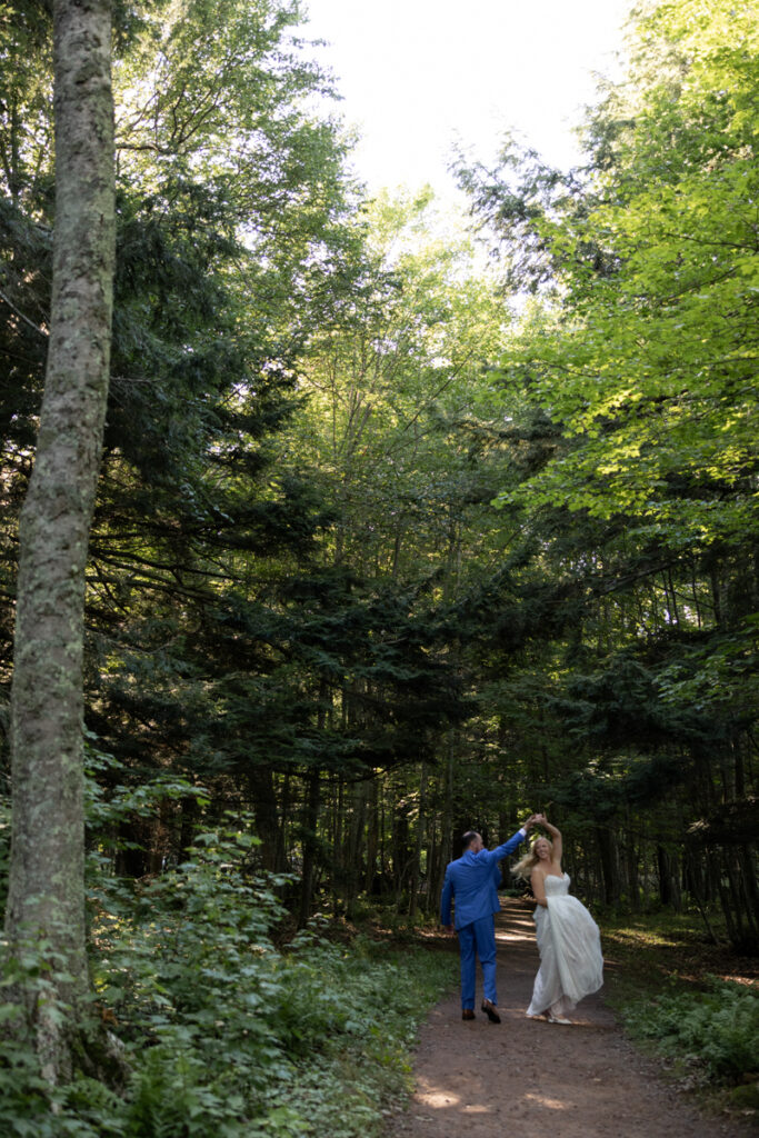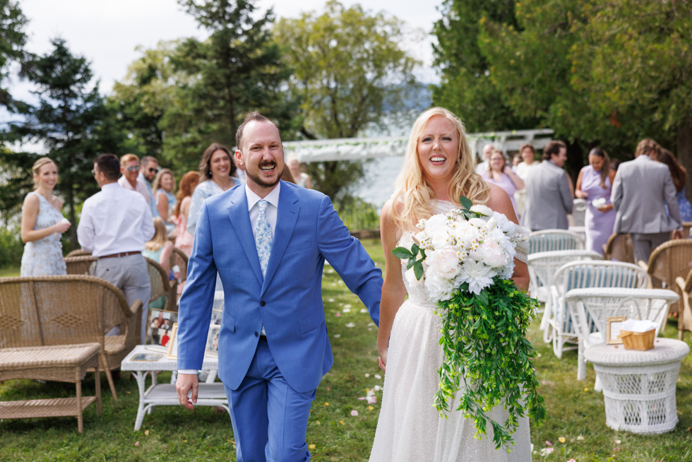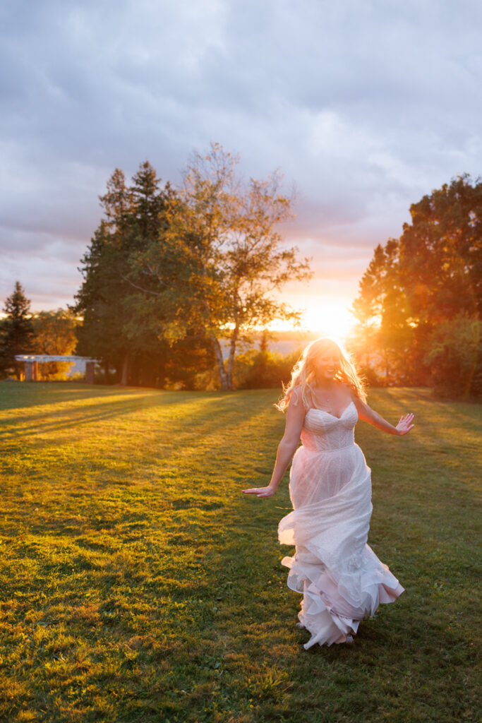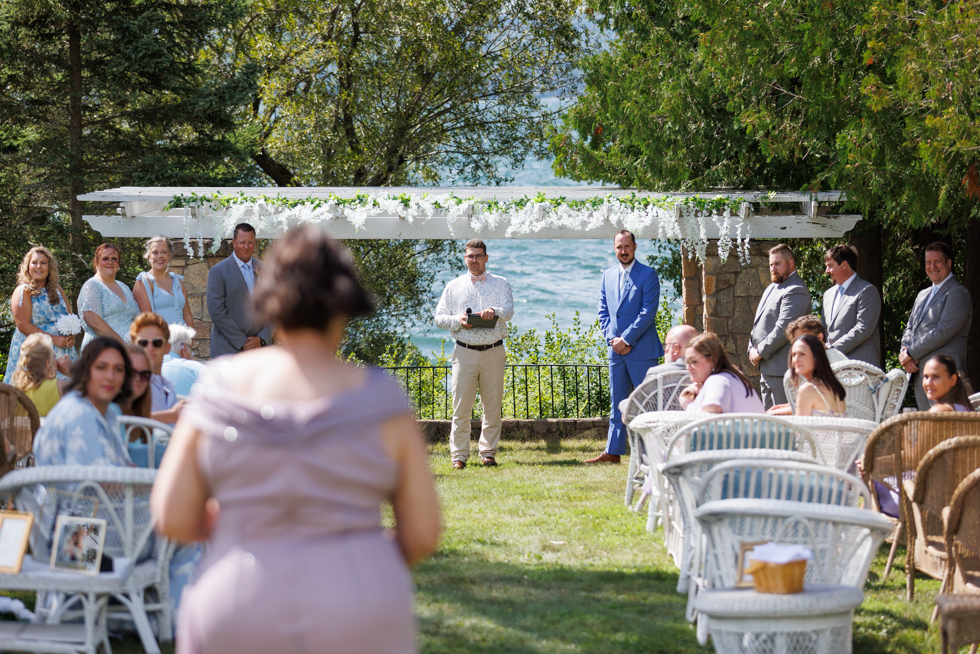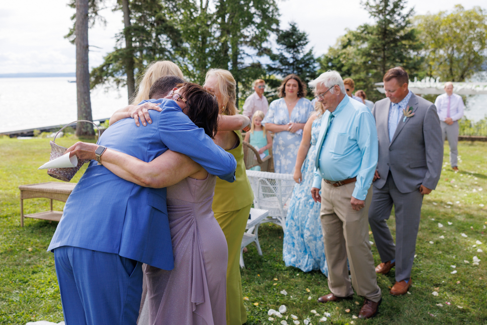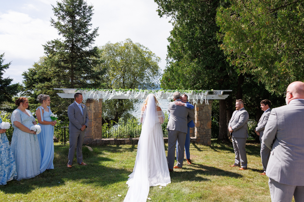 Congratulations Sarah and Max! What a fabulous destination wedding at Island Estate on Madeline Island. We started off the day taking the ferry from Bayfield to LaPointe, WI. As we pulled into the driveway of Island Estate we were greeted by the groom. There was energetic music playing throughout the house while the wedding party got ready. Max got ready in the game room and Sarah got ready in a bright airy guest room upstairs. The first look was as Sarah walked down the aisle in the backyard, a beautiful waterfront ceremony was set for the scene. The bride and groom said “I do” with a secret handshake!! After the ceremony champagne was popped and toasts were made… then we headed off to the state park for some Lake Superior cliff photos with the whole group. The reception continued with a cocktail hour back at Island Estate. Catering was by Fat Radish, so yummy. After dinner there was a fabulous sunset!! Everyone went inside for more speeches and then we ended the day with a fabulous dance. Enjoy the photos and video to remember the day.