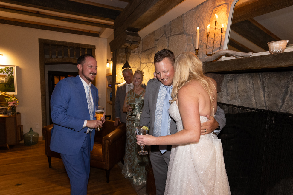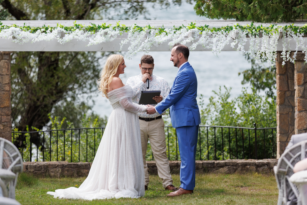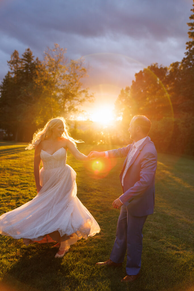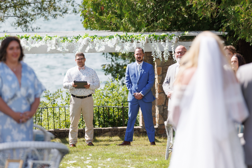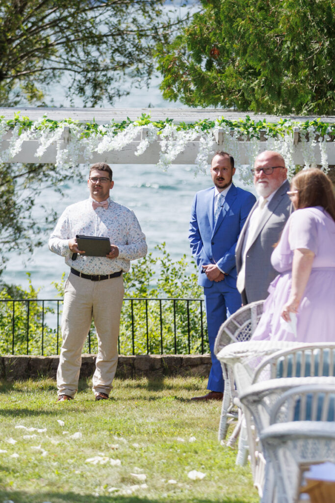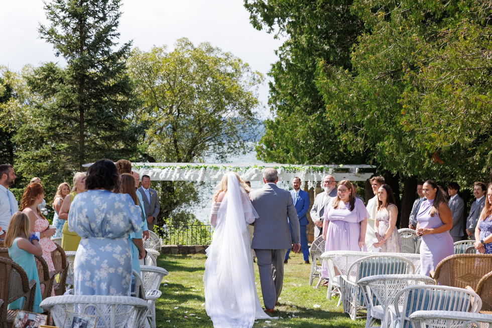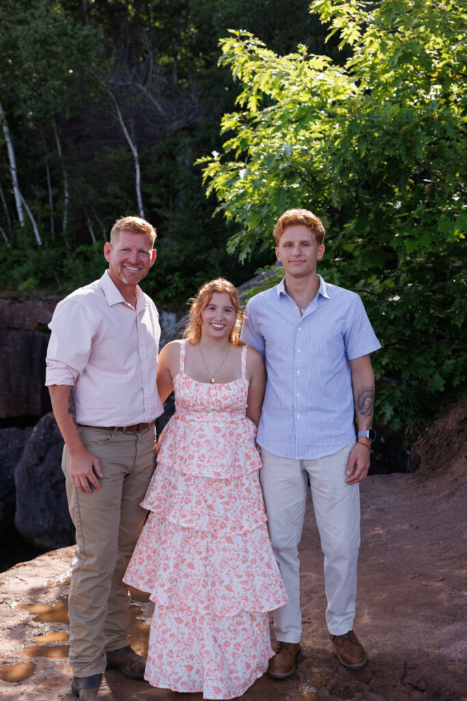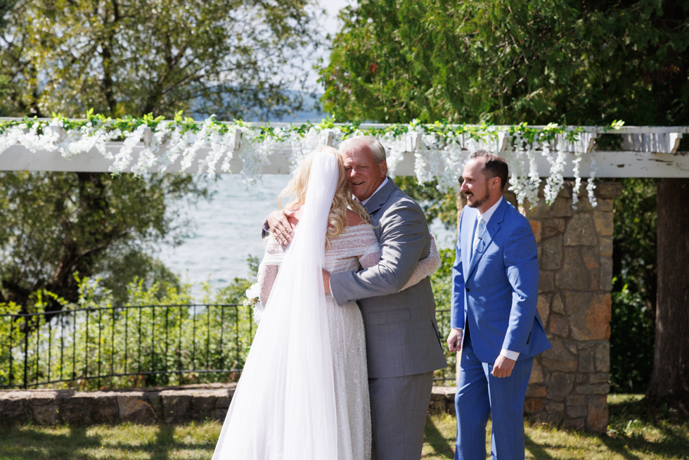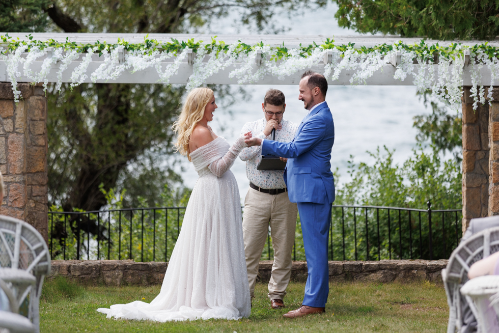 Congratulations Sarah and Max! What a fabulous destination wedding at Island Estate on Madeline Island. We started off the day taking the ferry from Bayfield to LaPointe, WI. As we pulled into the driveway of Island Estate we were greeted by the groom. There was energetic music playing throughout the house while the wedding party got ready. Max got ready in the game room and Sarah got ready in a bright airy guest room upstairs. The first look was as Sarah walked down the aisle in the backyard, a beautiful waterfront ceremony was set for the scene. The bride and groom said “I do” with a secret handshake!! After the ceremony champagne was popped and toasts were made… then we headed off to the state park for some Lake Superior cliff photos with the whole group. The reception continued with a cocktail hour back at Island Estate. Catering was by Fat Radish, so yummy. After dinner there was a fabulous sunset!! Everyone went inside for more speeches and then we ended the day with a fabulous dance. Enjoy the photos and video to remember the day.